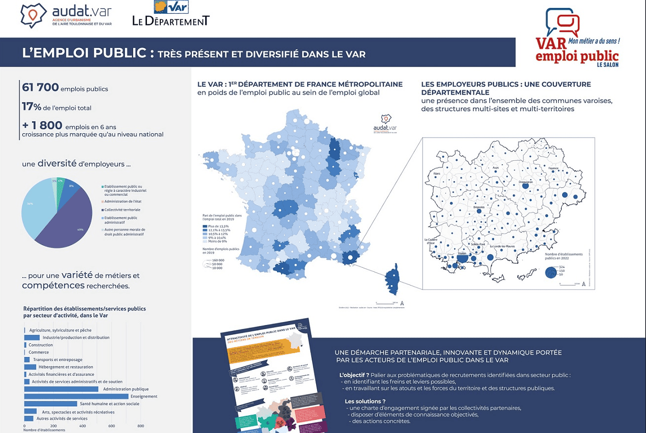 La fonction publique est un véritable pilier du territoire : le Var est le 1er département de France métropolitaine (hors COM) en part d’emploi public dans l’emploi total. En 2019, on y comptait près de 61 700 emplois publics (source : audat.var – INSEE), dont 40 % liés à la Défense, et plus de 63 900 actifs résidant dans le département travaillant pour une administration. Le territoire toulonnais concentre à lui seul 38 % de ces postes.